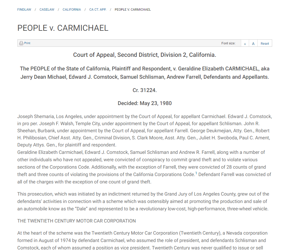 But of course she knows all that already because she’s seen the FBI files, court documents, has interviewed people involved at the time, spoken to engineers, seen the car in person, and read the enormous amount of newspaper and magazine articles that were written at the time, which are available for anyone to find.