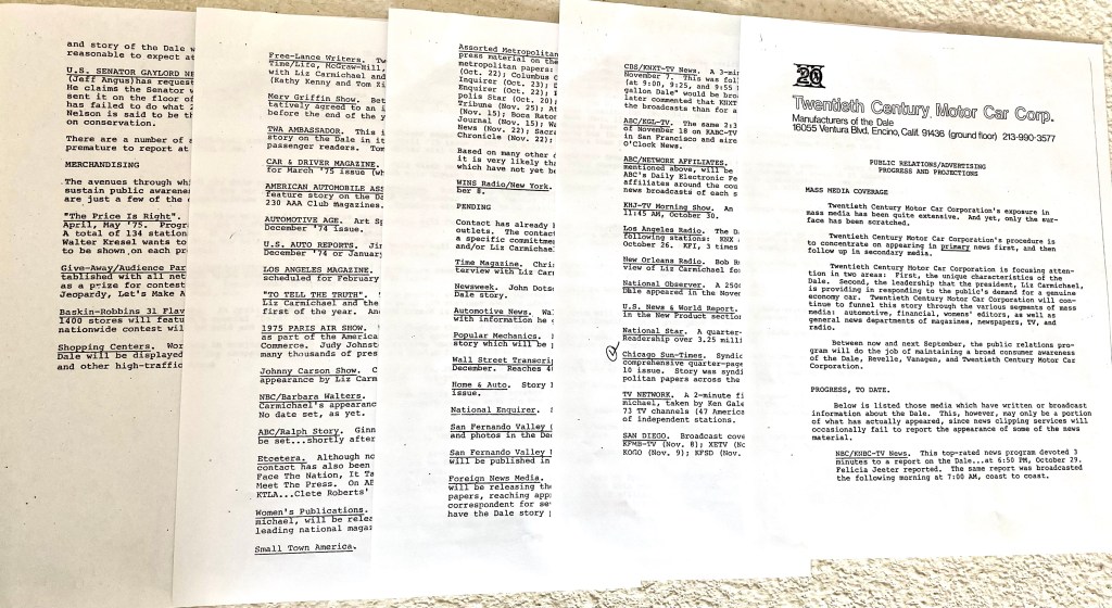 - CBS/KNXT-TV News. A 3-minute report by Bill Diez at 6:00pm, November 7. This was followed by three special announcements (at 9:00, 9:25, and 9:55pm) that a report on the “70-mile-per-gallon Dale” would be broadcast on the 11 O’Clock News. (Diez later commented that KNXT received more phone calls following the broadcasts than for any other news item in two years.)
